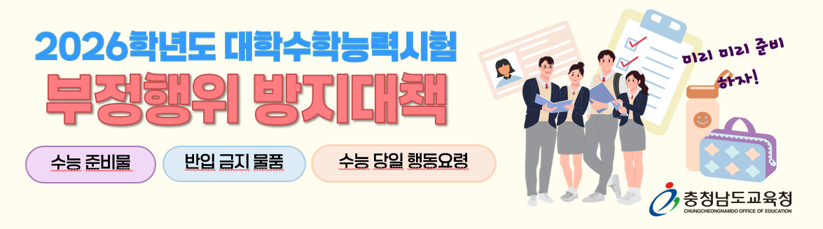 - 2026학년도 수능 부정행위 온라인 신고센터 운영 1) 운영기간: 2025. 10. 31.(금) ~ 2025. 11. 13.(목) 2) 탑재장소: [충청남도교육청 누리집]-[부서별 누리집]-[중등교육과]-[수능 부정행위 신고센터] 3) 유의사항 - 허위 제보 금지 - 부정행위와 무관한 민원이나 제안 또는 제보자의 인적사항, 연락처등 개인정보가 불분명한 경우 접수되지 않을 수 있음