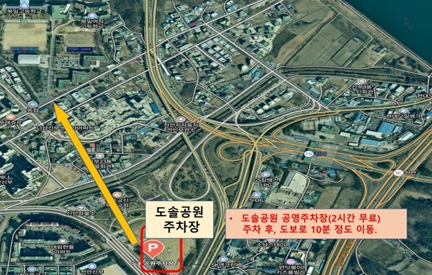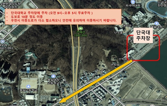 ▣ 주변 주차 안내 ---------------------------------------------------------------------------------------- 1. 개인 승용차 주차 가능 지역 -단국대학교 주차장(무료이용 가능, 오전9시~5시까지) -도솔공원 공용주차장 (2시간 무료)