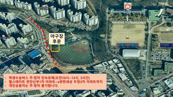 2. 학생수송 버스 주차 가능 지역 -야구장 쪽 후문 도로변, 오전10시~1시 단속유예로 버스만 주정차 가능합니다.(개인차량 주정차불가) (힐스테이트 천안신부1차아파트~이편한세상 두정3차아파트 구간)